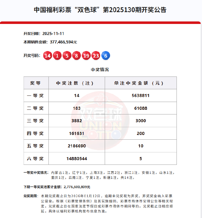 计奖结束后奖池余额为27.76亿余元。双色本期双色球全国销量为3.77亿余元,奖开奖池
